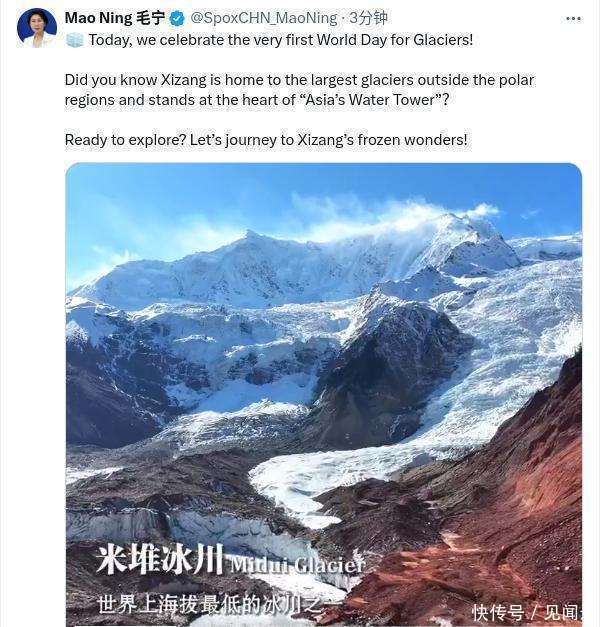 3月21日成为首个世界冰川日。当日,外交部发言人毛宁于海外社交媒体平台发布短视频,内容聚焦西藏冰川,画面中那壮观景象令人惊叹,此视频一经发布便迅速刷屏,相关话题也登上了微博热搜。
