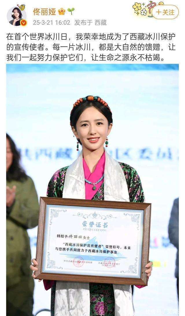 同一天,在西藏自治区成立60周年献礼电影《遥远的普若岗日》的杀青仪式上,徐柏青、佟丽娅、唐诗逸成为“西藏冰川保护宣传使者”。佟丽娅发文表示很荣幸担此角色,希望一起保护冰川让生命之源不断流。佟丽娅1983年生于新疆伊犁察布查尔,毕业于中央戏剧学院,是影视女演员兼舞者,网友纷纷祝贺。